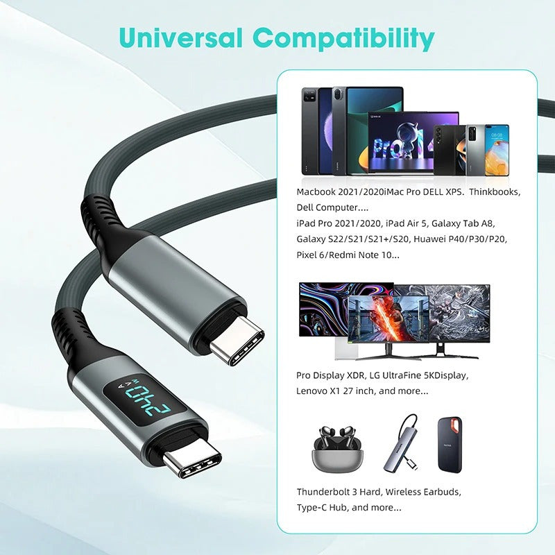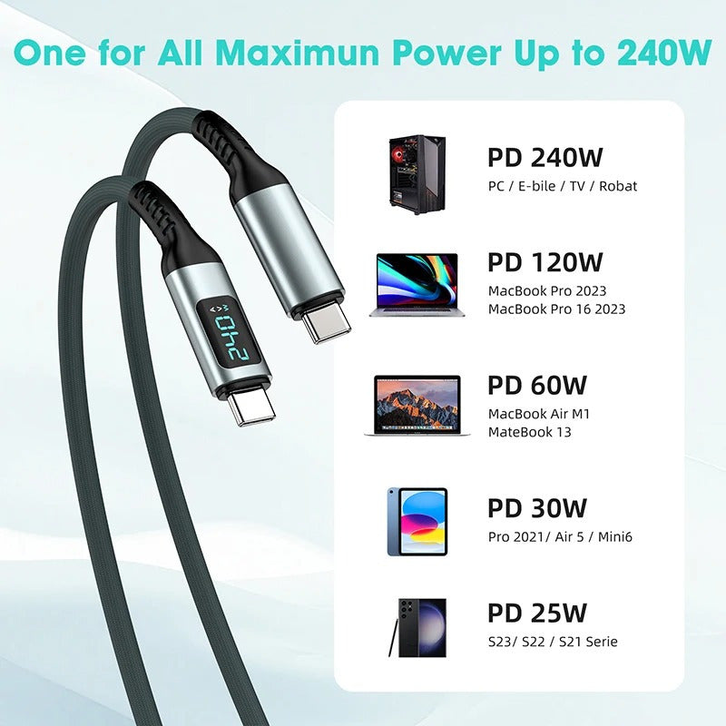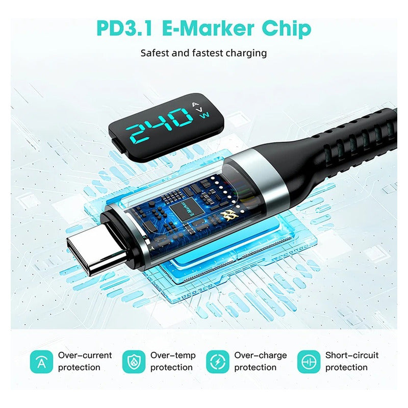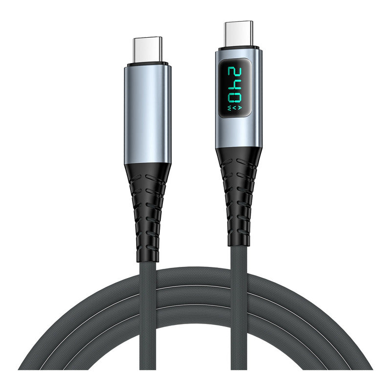 Cable USB4.0 Tipo C a Tipo C con Pantalla LED – PD 240W, Carga Rápida, Video 8K y Transferencia de Datos 40Gbps 2 Metros Descripción: Cable de alto rendimiento USB4.0 de Tipo C a Tipo C con pantalla LED integrada que muestra el estado de carga. Soporta carga rápida de hasta 240W 48V 5A máximo con protocolo PD3.1 y chip inteligente E-Marker, compatible con PD3.0 y PD2.0. Diseñado para equipos que requieren alta potencia como herramientas eléctricas, bicicletas eléctricas, fuentes de alimentación industriales o laptops gamer. Características: Modelo U4 Gen4 D 2M Material Aleación de aluminio y cable trenzado de nailon de alta resistencia Longitud 2 metros Corriente máxima 5A Potencia de salida 240W 48V 5A máximo PD3.1 compatible con PD3.0 y PD2.0 Compatibilidad de carga Adecuado para equipos de batería de iones de litio herramientas eléctricas bicicletas eléctricas fuentes industriales y dispositivos de alto voltaje Velocidad de transferencia de datos Hasta 40Gbps estándar USB4.0 retrocompatible con Thunderbolt 4 y 3 USB 3.2 3.1 3.0 y 2.0 Salida de video Compatible con 8K a 60Hz o doble 4K a 60Hz Dispositivos compatibles PS5 Nintendo Switch computadoras monitores laptops gamer herramientas eléctricas y más Funciones principales: Pantalla LED que muestra en tiempo real el estado de carga Carga ultrarrápida con potencia de hasta 240W para alimentar y cargar dispositivos exigentes Transferencia de datos veloz de hasta 40Gbps para mover archivos grandes en segundos Video de alta resolución con soporte para 8K o doble 4K con alta tasa de refresco Durabilidad gracias a su cable trenzado de nailon y conectores en aleación de aluminio para uso prolongado